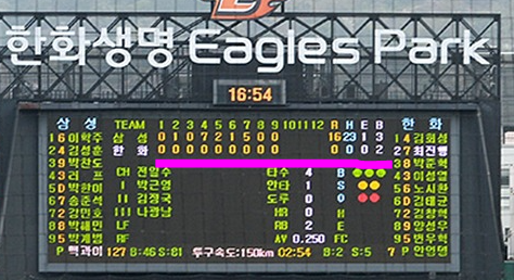 전광판에 상대팀의 득점과 안타수가 모두 0이면 됩니다.